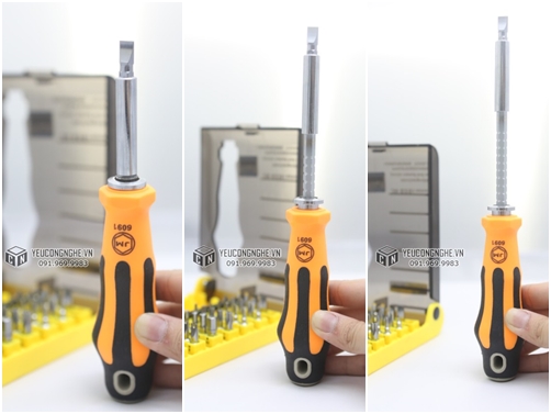 - Bao gồm thanh trụ kim loại giúp bạn nối dài và điều chỉnh độ dài tùy ý cho tua vít - điều đặc biệt mà các hộp tua vít đa năng khác ngoài thị trường không làm được.