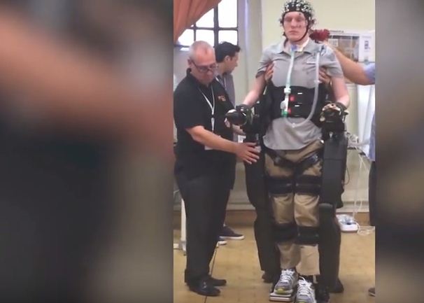 Bộ xương máy đeo quanh hông và chân người đàn ông trong clip là một phần của công nghệ mới do các nhà nghiên cứu Đức và Hàn Quốc phát triển. Phần còn lại là chiếc mũ gắn điện cực, có tác dụng kết nối não và bộ xương máy.