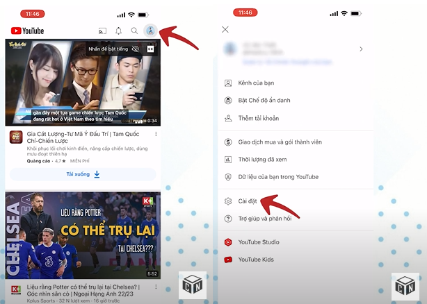 Bước 1: Tại ứng dụng Youtube của bạn, nhấn vào biểu tượng tài khoản của bạn ở góc trên bên phải > Chọn vào mục Cài đặt.