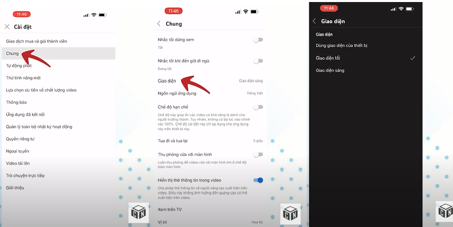 Bước 2: Chọn vào Chung > Gạt nút Giao diện tối sang trái để chuyển tắt chế độ Dark Mode.