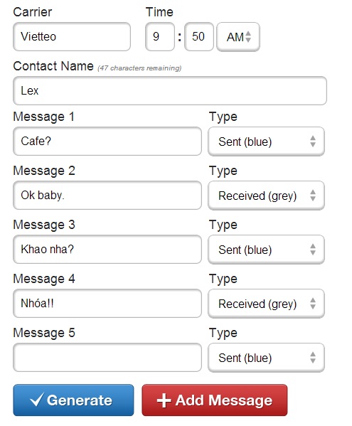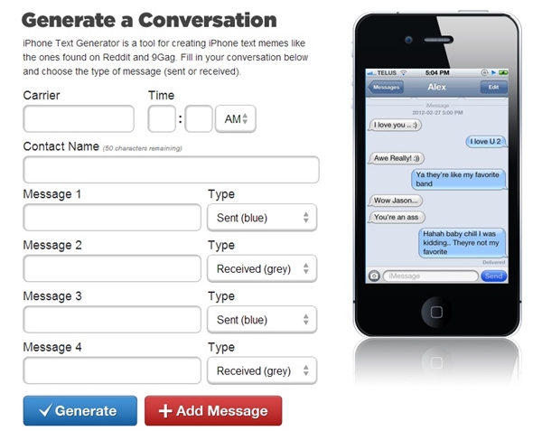 iPhone Text Generator là một công cụ trực tuyến giúp người dùng dàn dựng lên ‘câu chuyện tin nhắn’ khá thú vị, và nó được cung cấp miễn phí và không giới hạn số lượng tin nhắn mà người dùng muốn ‘sáng tác’. Nếu có khiếu hài hước, chắc chắn bạn sẽ tự ‘sáng tác’ cho mình những câu chuyện vui đầy sáng tạo trên màn hình iPhone và chia sẻ cho mọi người cùng xem.