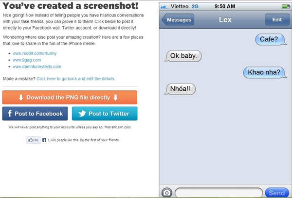 Dạo gần đây trên Internet xuất hiện trào lưu chế các câu chuyện vui bằng hình ảnh tin nhắn đối đáp giữa 2 nhân vật trên iPhone. Người viết có một điều thắc mắc là tác giả đã làm thế nào chụp lại màn hình iPhone mà có thể chụp luôn cả hình dáng của thiết bị? Và theo tìm hiểu thì họ đã sử dụng dịch vụ của iPhone Text Generator.