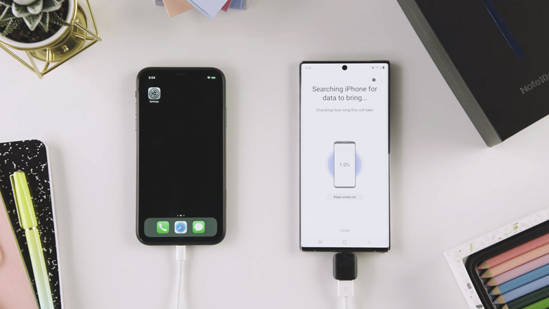 Bước 1: Kết nối iPhone và thiết bị Galaxy lại với nhau bằng cap Lightning ra USB-C hoặc USB-C ra USB-C tương thích.
