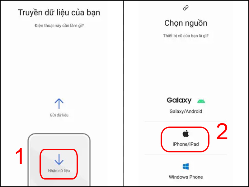 Bước 2: Mở ứng dụng Smart Switch trên thiết bị Galaxy và chọn Nhận dữ liệu > Sau đó chọn iPhone/iPad.