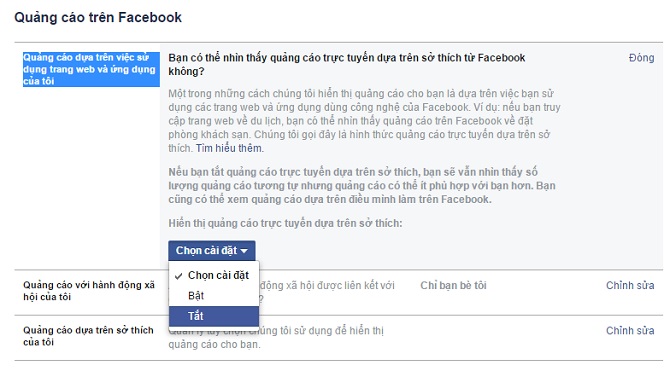 Trong mục "Quảng cáo dựa trên việc sử dụng trang web và ứng dụng của tôi", chọn "Chỉnh sửa". Trong ô tùy chọn phía dưới, chọn "Tắt".