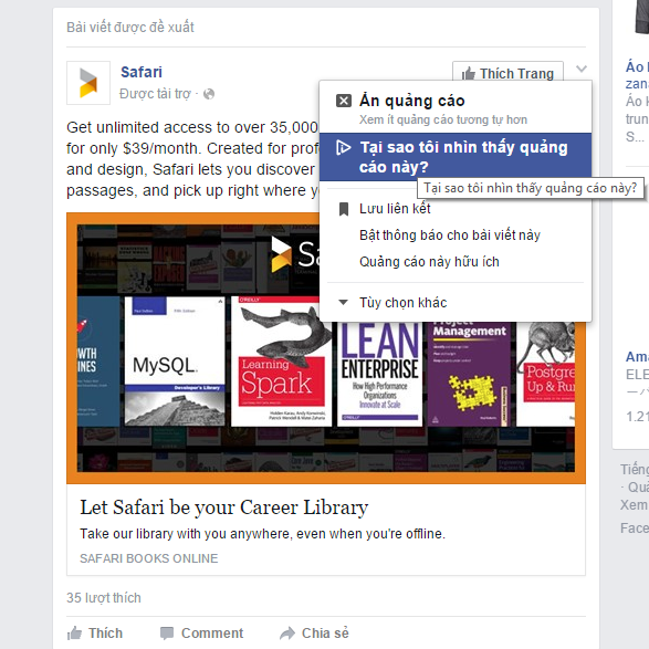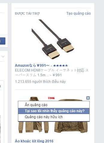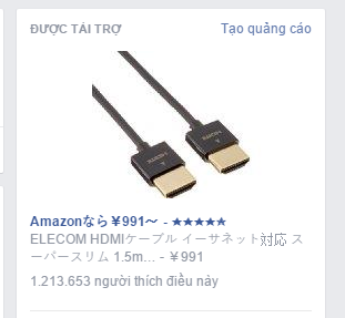 Cookie cho phép các trang web khác có thể thu thập thông tin của bạn và gửi về mạng quảng cáo của Facebook hoặc bên thứ 3 để hiển thị các mẩu quảng cáo này trên trang chủ hoặc bảng tin Facebook của bạn. Ví dụ, do tôi thường xuyên ghé thăm Amazon.co.jp nên Facebook cũng thường hiển thị quảng cáo từ trang bán hàng này lên trang chủ của tôi: