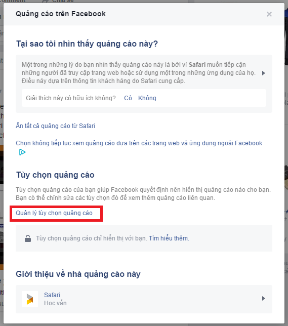 Dù bạn chọn cách nào, cửa sổ quản lý quảng cáo của Facebook cũng sẽ được hiển thị. Hãy chọn "Quản lý tùy chọn quảng cáo":