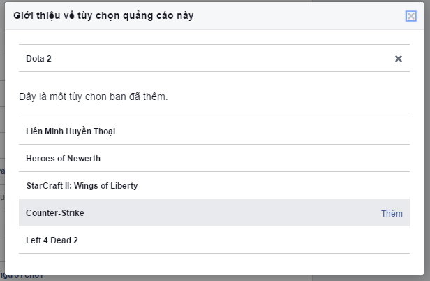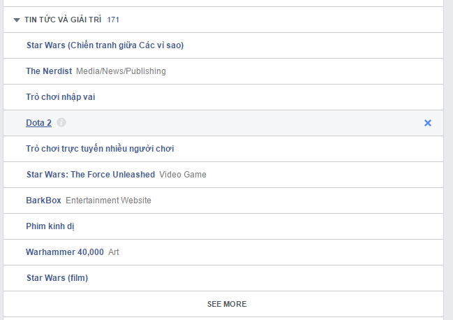 Tôi không thể nhớ đã "thêm" tùy chọn này khi nào. Dù sao, tôi chọn dấu X trên trang này để bỏ đầu mục DOTA2 khỏi mục sở thích của mình. Khi xác nhận điều này, Facebook đưa ra thông báo cho tôi rằng "Khi bạn xóa một tùy chọn, chúng tôi sẽ không hiển thị cho bạn quảng cáo dựa trên tùy chọn đó nữa. Bạn vẫn có thể nhìn thấy quảng cáo tương tự dựa trên các tùy chọn khác của mình. Việc chỉnh sửa tùy chọn của bạn sẽ ảnh hưởng đến mức độ liên quan chứ không phải số lượng quảng cáo mà bạn nhìn thấy".