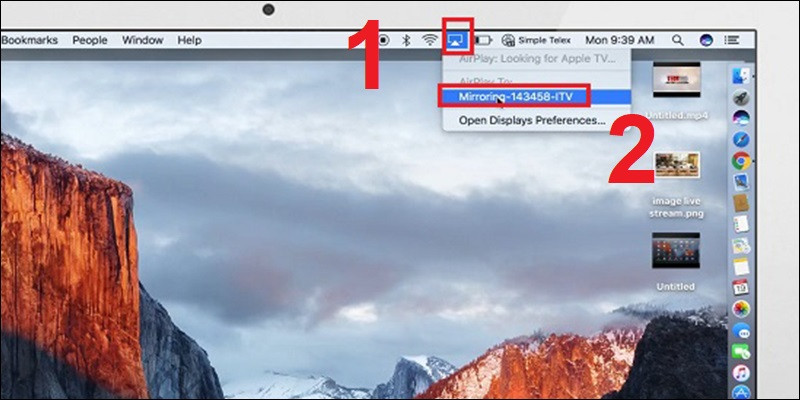 Bước 7: Bấm vào biểu tượng Airplay (nằm ở phía trên bên phải màn hình Macbook) > Chọn Mirroring máy chiếu của bạn để chia sẻ màn hình.