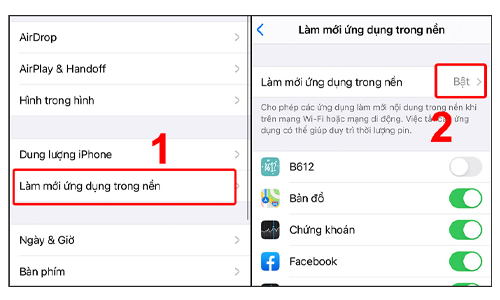 Bước 4: Có 2 lựa chọn ở mục này là tắt làm mới một số ứng dụng mà bạn cảm thấy không cần thiết và giữ lại làm mới những ứng dụng hữu ích (VD: Zalo, facebook) hoặc tắt hết toàn bộ chức năng Làm mới Ứng dụng trong nền.