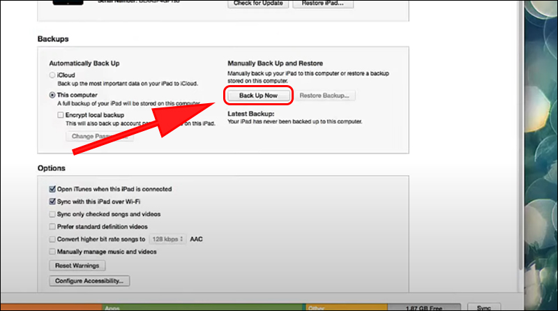 Bước 2: Mở iTunes > Chọn Back up now (Sao lưu ngay bây giờ) để sao lưu thiết bị.