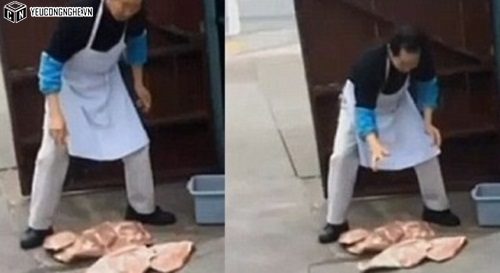 Một đầu bếp tại nhà hàng Trung Quốc ở Mỹ rã đông thịt bằng cách đập liên tiếp lên vỉa hè khiến nhiều người kinh hãi.