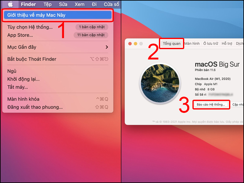 Bước 1: Vào Menu Quả táo > Giới thiệu về máy Mac này (About this mac) > Tổng quan (More Info) > Báo cáo hệ thống (System report).