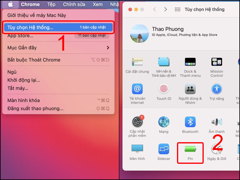 Bước 1: Vào Menu Quả táo > Tùy chọn hệ thống (System Preferences) > Chọn Pin (Battery).