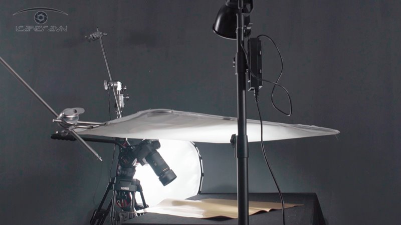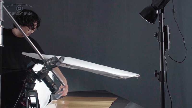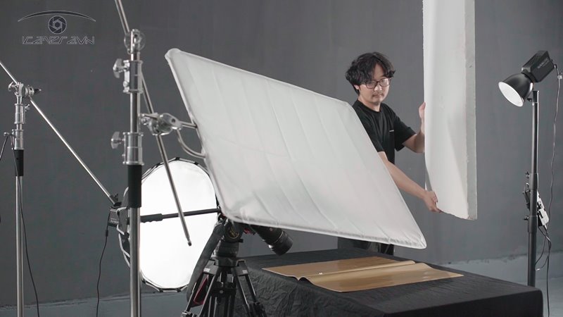 Trải giấy vàng trên bàn làm việc và chụp với ống kính hướng từ trên xuống. Forza 60 đặt ở vị trí thấp với lồng chụp phía trên để tăng độ mở của khung hình .Chiếc Forza 60 còn lại đặt ở vị trí cao kết hợp với tấm vải mềm để tăng tính kim loại.
