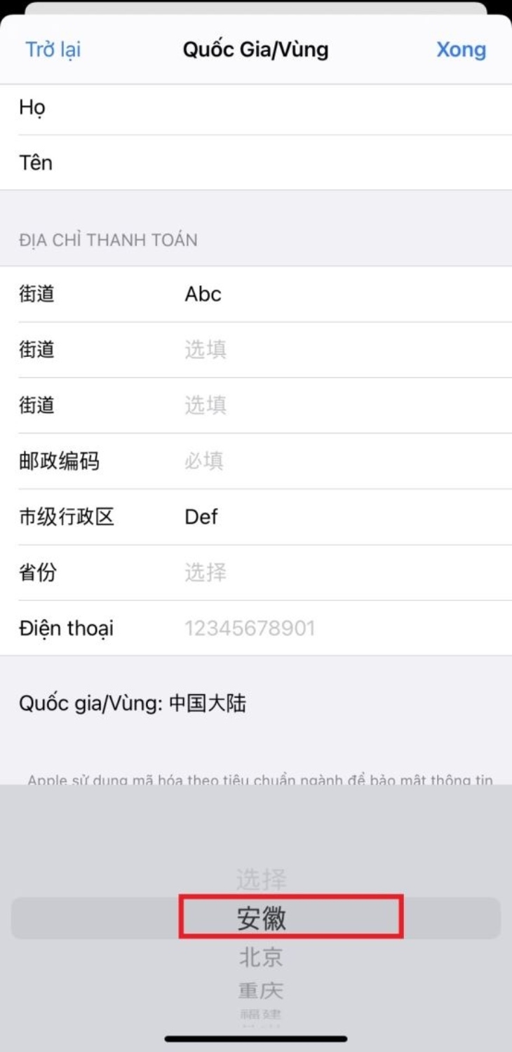 Bước 4: Phần địa chỉ thanh toán, dòng đầu tiên bạn điền Abc, dòng thứ năm bạn điền Def, dòng thứ 6 chọn lựa chọn thứ 2.