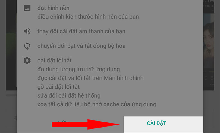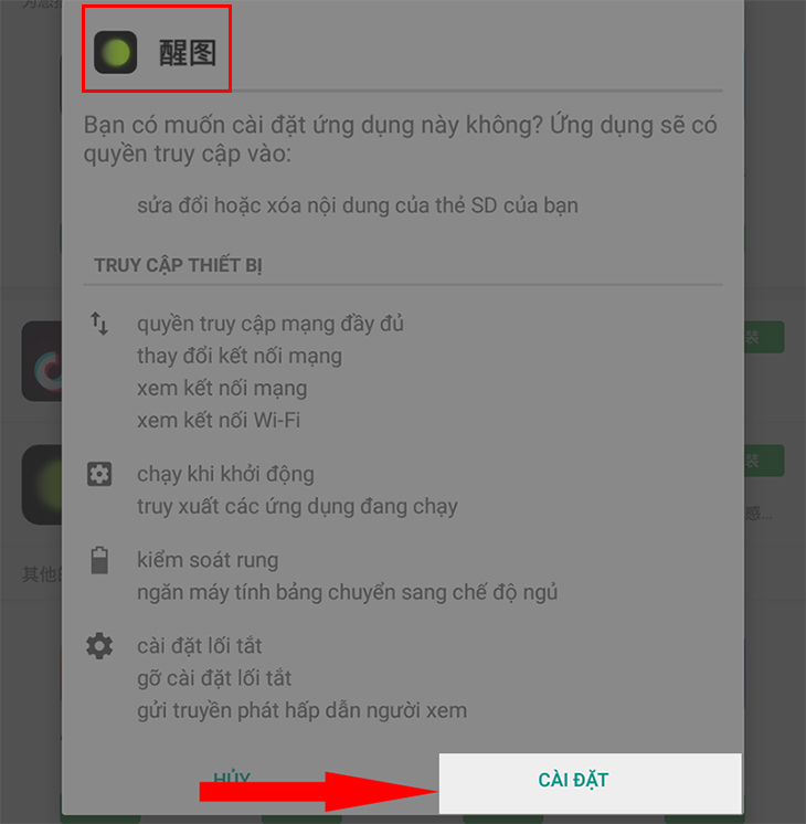 Lúc này, cửa sổ mới hiện ra. Ứng dụng hiển thị các yêu cầu về quyền truy cập, bạn hãy chọn mục Cài đặt.