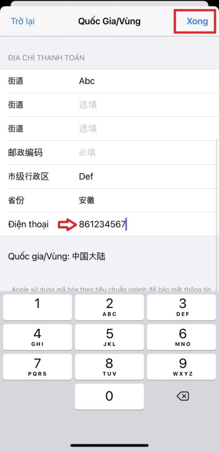 Bước 5: Điền số điện thoại, mã vùng của Trung Quốc là 86, hãy điền số 86 đầu tiên sau đó bạn có thể thêm 7 chữ số bất kỳ, chọn Xong.