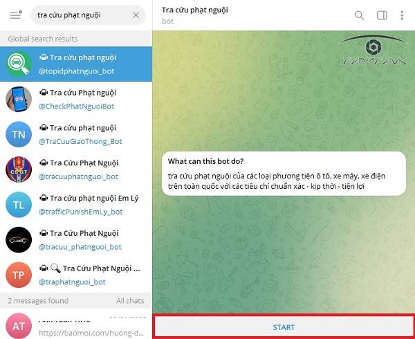 Nhấn vào mục Start để kích hoạt bot tra cứu.