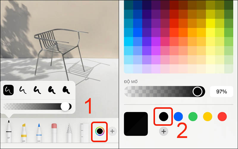 - Bước 4: Nhấn vào biểu tượng hình tròn để chọn màu cho nét vẽ > Tiến hành chọn màu.