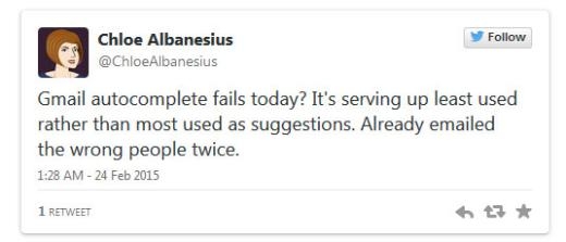 Người dùng Chloe Albanesius cho biết: "Chức năng tự động hoàn thiện của Gmail bị lỗi hôm nay? Nó hiện ra những gợi ý ít dùng nhất, thay vì dùng nhiều nhất. Tôi đã gửi thư nhầm người tới hai lần."
