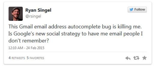 Một người dùng khác chỉ trích: "Lỗi tự động hoàn thiện của địa chỉ thư điện tử Gmail làm tôi rất bực mình. Có phải chiến lược xã hội mới của Google là gửi thư cho những người tôi không nhớ ra?"