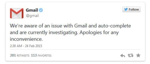 Đại diện của Gmail bình luận về sự cố trên tài khoản Twitter: “Chúng tôi biết Gmail đang có vấn đề và chức năng tự động hoàn thiện đang được xem xét. Chúng tôi xin lỗi về những bất tiện.”