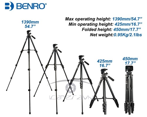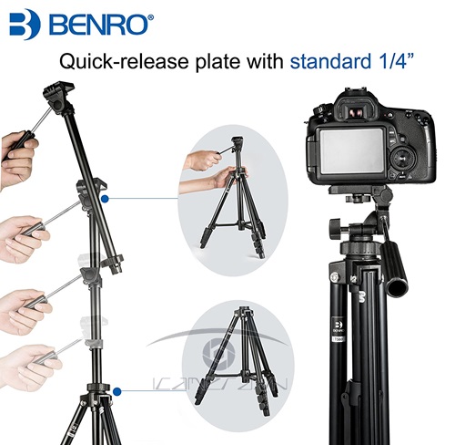 Đế báng dễ dàng lắp và tháo camera, ốc vít gắn 1/4" phổ thông. Chân máy đạt đến độ cao tối đa là 56,5". với phần thân trụ trung tâm mở rộng và có chiều cao khi hoạt động tối thiểu là 14 ".
