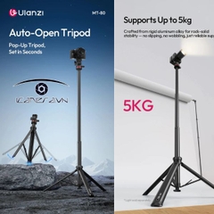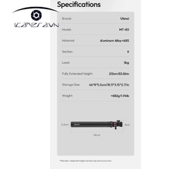 Chân máy Ulanzi MT-80 là chân đèn/đỡ thiết bị nhỏ gọn, làm từ hợp kim nhôm và ABS, gồm 6 đoạn, chịu tải đến 5 kg, cao tối đa 213 cm và lưu trữ gọn 46 × 8 × 5.5 cm. Sản phẩm nặng ~882 g, mở tự động khi chạm đất và có đầu vít 1/4″ tương thích với máy ảnh, đèn trợ sáng. Bộ gồm chân và túi đựng.