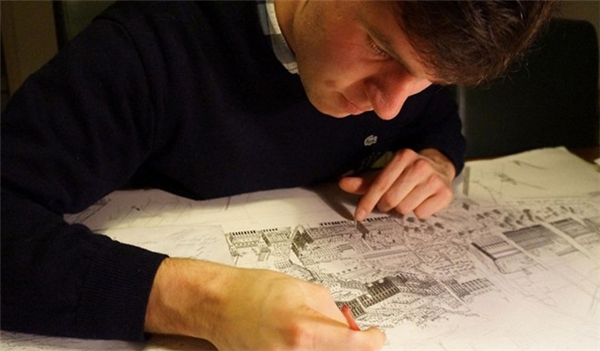 Chỉ với bút, giấy và mực in, chàng họa sĩ trẻ Stefan Bleekrode có thể vẽ lại khung cảnh những thành phố nơi anh đã đi qua đẹp đến từng chi tiết từ trí nhớ của mình.