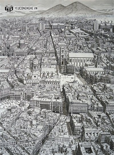Chàng họa sĩ trẻ tuổi sống và làm việc tại Eindhoven, Hà Lan đã vẽ những bức tranh phác họa các thành phố nổi tiếng - nơi anh từng đi qua. Trong ảnh là địa danh Spacca Napoli, Naples, Italy.
