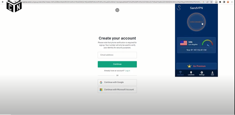 Bước 4: Nạp xong các bạn mở tab ChatGPT đăng ký, Nhớ bật VPN và chọn US tức là Mỹ. Các bạn cứ nhập đầy đủ thông tin đến bước nhập số điện thoại