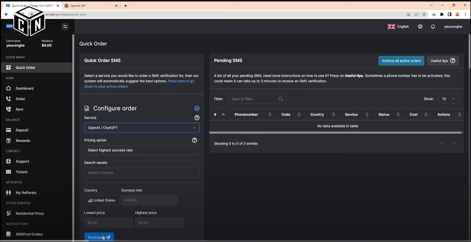 Bước 5: Quay lại SMS pool, chọn Quick order rồi Chọn Country là United state, mục service thì chọn là Open AI, pricing option thì bạn để select highest success rate để có tỷ lệ thành công cao hơn. Ấn purchase đợi lấy số ở bên phải.