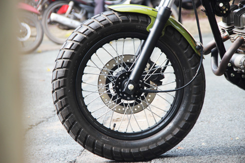 Để tiện dụng hơn cho nhu cầu phượt, xe trang bị bộ nhún sau lớn hơn nguyên bản. Lốp gai bản rộng, kích thước bánh trước 120/90-17 kèm phanh đĩa đơn, bánh sau 130/80-17 kèm phanh tang trống.