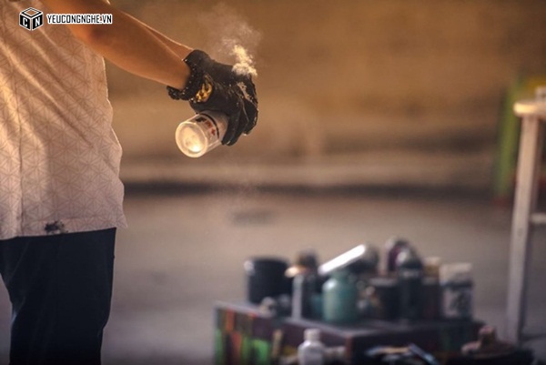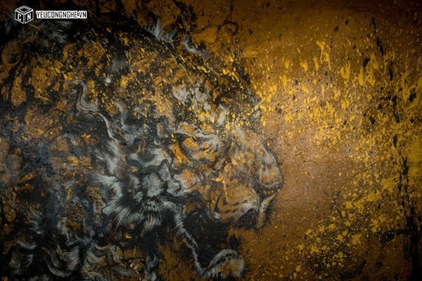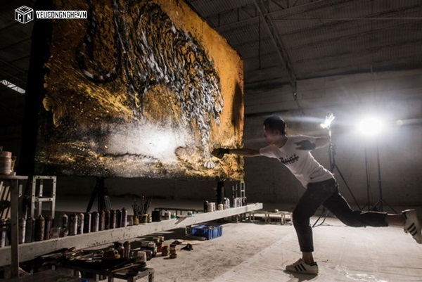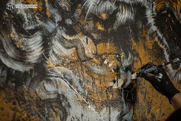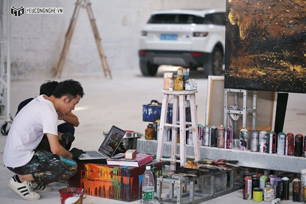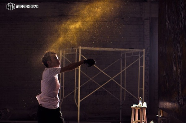 Một người nghệ sỹ đã kết hợp nhiều kỹ thuật khác nhau để hoàn thiện tác phẩm nghệ thuật của mình. Ông rắc sơn lên khung tranh theo những cách độc đáo riêng biệt.