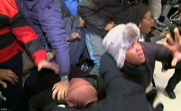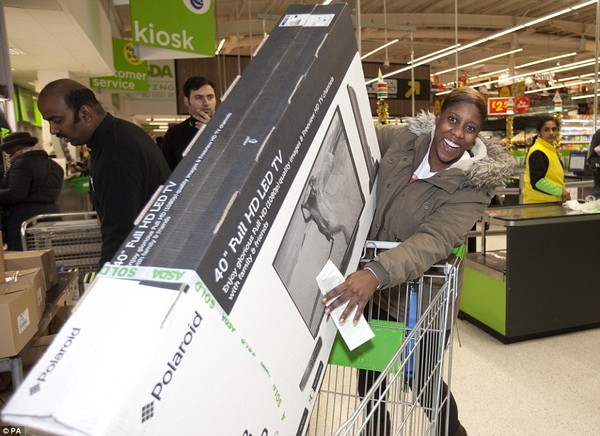 Một cảnh tượng gây sốc: Một phụ nữ cố gắng nằm đè lên chiếc ti vi sau khi cãi nhau tranh giành chiếc ti vi này với những khách hàng khác tại 1 cửa hàng Asda ở Wembley.