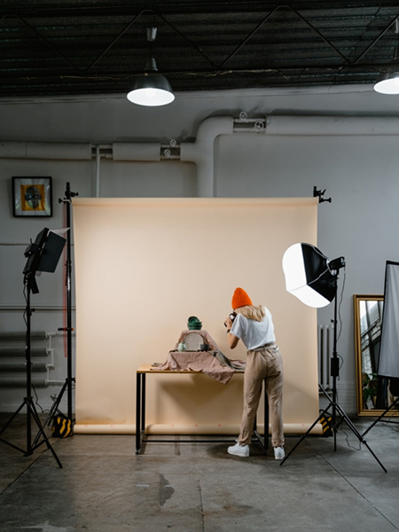 – Phông nền: Thông thường, sản được chụp trên phông nền đơn sắc (thường là màu trắng). Vừa giúp nội bật được sản phẩm vừa có thể dễ dàng chỉnh sửa nếu muốn chèn kiểu phông nền khác. Đối với những sản phẩm nhỏ chỉ cần mấy tờ giấy trắng là được một phông nền trắng hoàn chỉnh, tiết kiệm chi phí. Với những sản phẩm to hoặc chụp người mẫu, chân dung bạn có thể trang bị thêm các loại khung treo phông với các kích thước to nhỏ khác nhau.