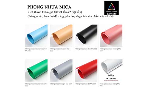 - Phông mica ngày càng được ưa chuộng vì tính chât bền bỉ, mềm dẽo, không thấm nước và dầu. Vì màu sắc lúc nào cũng giữ được như tươi mới và đạt tính chất quan trọng là không phản xạ ánh sáng nên trở thành 1 thành phần không thể thiếu khi chụp ảnh sản phẩm.