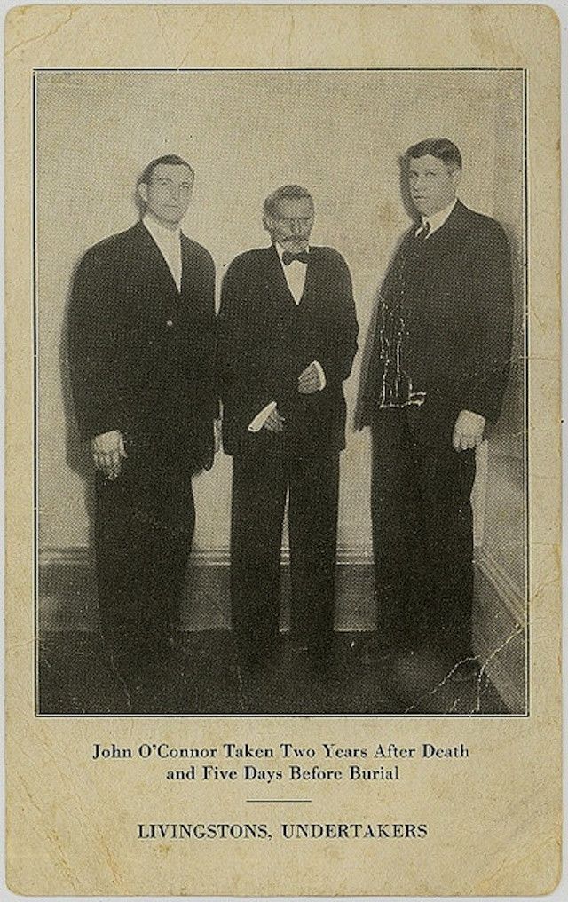 Đôi khi người chết sẽ được bố trí một tư thế đứng sống động, giống như quý ông đứng giữa trong hình dưới. Bức hình này chụp năm ngày trước khi thi thể của ông được đem đi chôn cất.