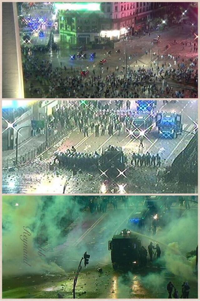 Những phần tử quá khích gây náo loạn, đập vỡ cửa kính các cửa hàng và đập phá một nhà hát, tấn công các nhà báo cũng như cảnh sát bằng đá, chai lọ. |