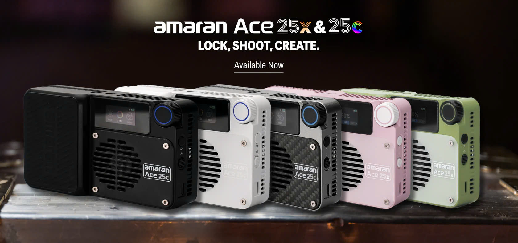 - Amaran Ace 25x là đèn LED hai màu có thể gắn trên máy ảnh với công suất đầu ra lên đến 32W được thiết kế cho những người sáng tạo đang di chuyển. Với giá đỡ tháo nhanh amaran Ace Lock và cường độ ánh sáng tốt, thời lượng pin cao và đèn có chế độ sạc nhanh khi sử dụng củ sạc 45W, amaran Ace 25x là một loại đèn sáng rực rỡ nhưng nhỏ gọn sẵn sàng làm cho nội dung của bạn tỏa sáng.