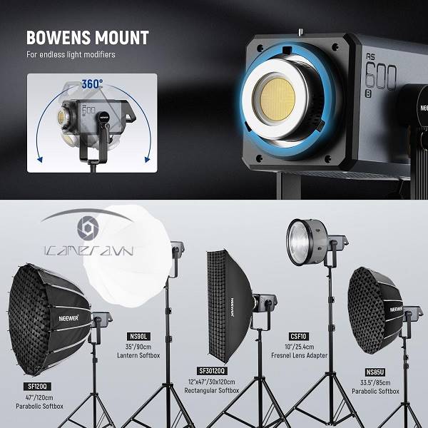 - Thiết kế chu đáo: Giá đỡ Bowens phù hợp với nhiều bộ điều chỉnh ánh sáng khác nhau và giá đỡ chữ U 360° cho phép định vị linh hoạt. Đặt đèn bên trong hộp đựng xe đẩy chắc chắn để dễ dàng cất giữ và vận chuyển. Để tăng độ sáng, vui lòng sử dụng Ống kính Fresnel NEEWER CSF10 (bán riêng)