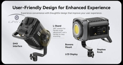 - Công suất mạnh mẽ 200W: Hạt đèn COB hiệu suất cao cung cấp ánh sáng đồng đều, dịu nhẹ với 48300 Lux ở 6500K@1m (có chóa phản quang).