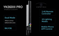 - Bộ điều khiển APP di động: YN360 III Pro hỗ trợ APP trên điện thoại di động để điều khiển Đèn video LED, đọc độ sáng và kênh nhóm của đèn video LED hiện tại, có thể điều khiển công tắc và độ sáng của 8 nhóm đèn video riêng biệt và dễ dàng hoàn thành nhu cầu chụp ảnh