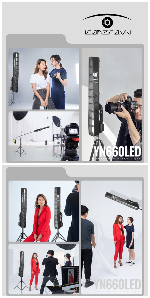 Thiết bị này là mẫu mới nhất của hãng Yongnuo với thiết kế YN660LED RGB rất thành công, được các nhà làm phim và youtuber đặc biệt yêu thích.YN660LED RGB được trang bị 672 đèn LED cổ điển và 120 đèn LED RGB, cho phép phát ra ánh sáng với màu sắc sặc sỡ.Đèn LED tiêu chuẩn được chia thành hai nhóm với nhiệt độ màu là 2200K và 9900K.Cường độ của mỗi nhóm có thể được điều chỉnh độc lập.