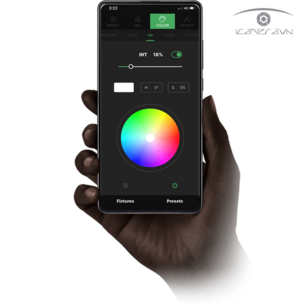 Đèn có thể được điều khiển với các nút trên thân, nhưng nhà sản xuất còn trang bị khả năng điều khiển qua Bluetooth kết nối với smartphone để bạn thay đổi từ pha, phù hợp cho việc thiết lập nhiều đèn tạo thành hệ thống chiếu sáng. Với 9 hiệu ứng chiếu sáng “Paparazzi,” “Fireworks,” “Lightning,” “Faulty Bulb,” “TV,” “Breath,” “Flash,” “Explosion,” và “Fire” thì hệ thống đèn sẽ tạo ra những hiệu ứng để người dùng làm phim được thoải mái sáng tạo.