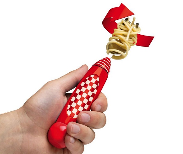 Với kết cấu mô-tơ xoay tròn nằm bên trong, người dùng chỉ việc bấm nút và đưa nĩa vào dĩa mì, nó sẽ tự động cuộn tròn mì lại cho bạn mà chẳng phải tốn calo vận động làm gì.