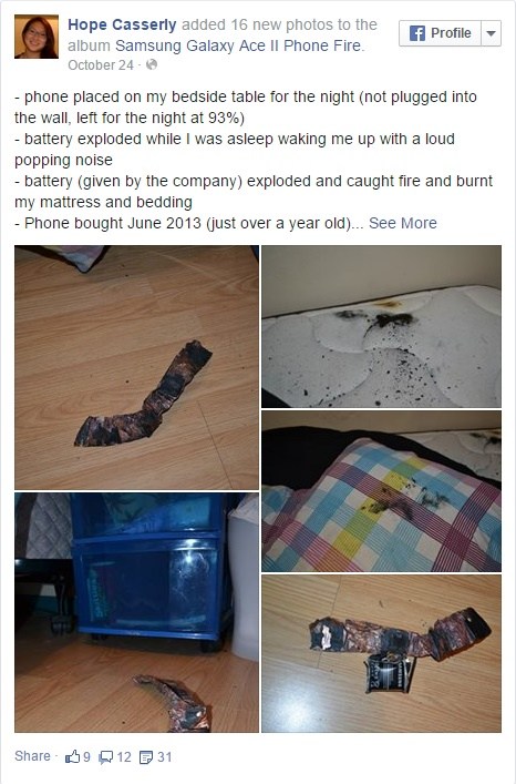 Sau khi sự việc xảy ra, người đại diện của Samsung đã phát biểu trên CBC rằng, trong quá trình xem xét chiếc điện thoại đã phát nổ, Samsung đã phát hiện ra Hope Casserly sử dụng một viên pin không chính hãng. Tuy nhiên, ngay lập tức Casserly đã bác bỏ thông tin này và khẳng định rằng cô chưa hề thay đổi pin của chiếc điện thoại từ lúc mua tới lúc phát nổ.