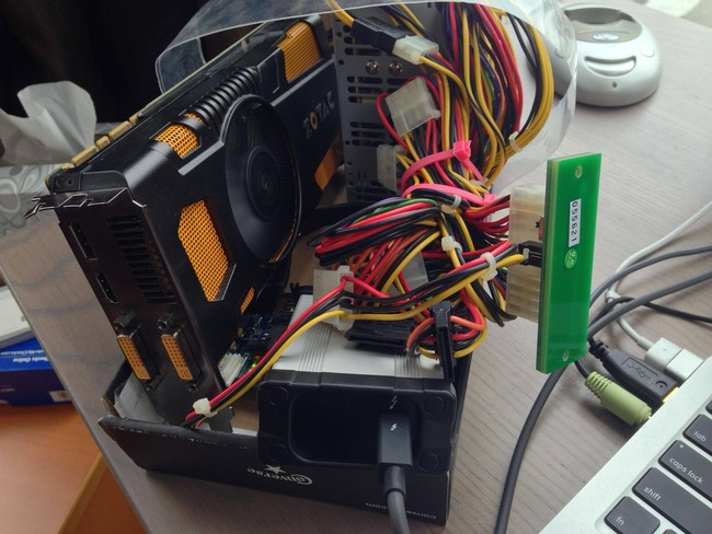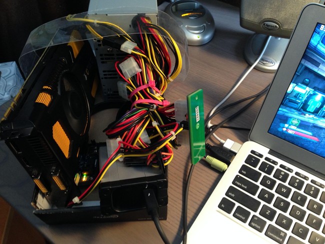 Larry Gadea đã sử dụng bộ chuyển đổi cổng Thunderbolt – Express Card sau đó kết nối tiếp với bộ chuyển đổi Express Card – PCI-Express và cuối cùng là tín hiệu được xuất ra một màn hình tương thích với Windows. Kết quả cuối cùng trong thử nghiệm khá cồng kềnh nhưng với đam mê của một game thủ thì việc mang lại trải nghiệm chơi game tuyệt vời là điều quan trọng nhất.