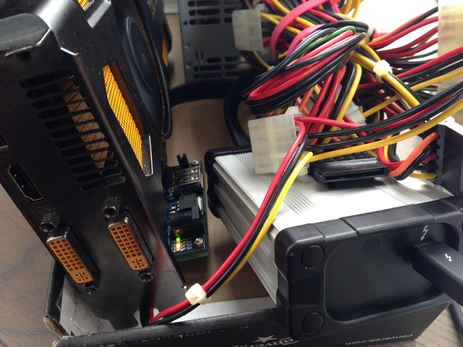 Không chịu khuất phục, Larry Gadea, một thành viên tại diễn đàn công nghệ cao Inferno đã tạo ra một thiết kế độc đáo trong đó anh kết nối card đồ họa rời với chiếc MacBook Air 11-inch thông qua loạt bộ điều khiển tích hợp.